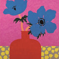 ピンクの壁に赤い花瓶、眩しいほど青い花弁。