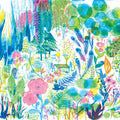 色の組み合わせにより植物が形を見せ、森の中心にテーブルがあり動物たちが集まってきている様子です。