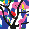 カラフルな鳥たちに混じり、赤い猫が木でくつろいでいる。